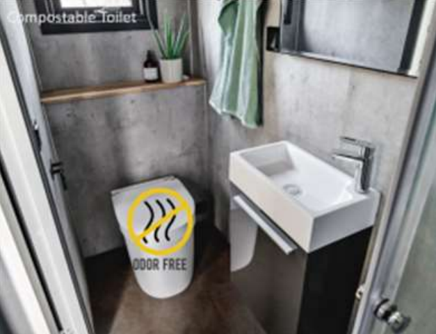 The toilet can be operated with 230 V or with 12 V solar cell / battery power. The fan has very low energy consumption and is therefore suitable for battery or solar cell operation as well. The battery and battery cables are not included.