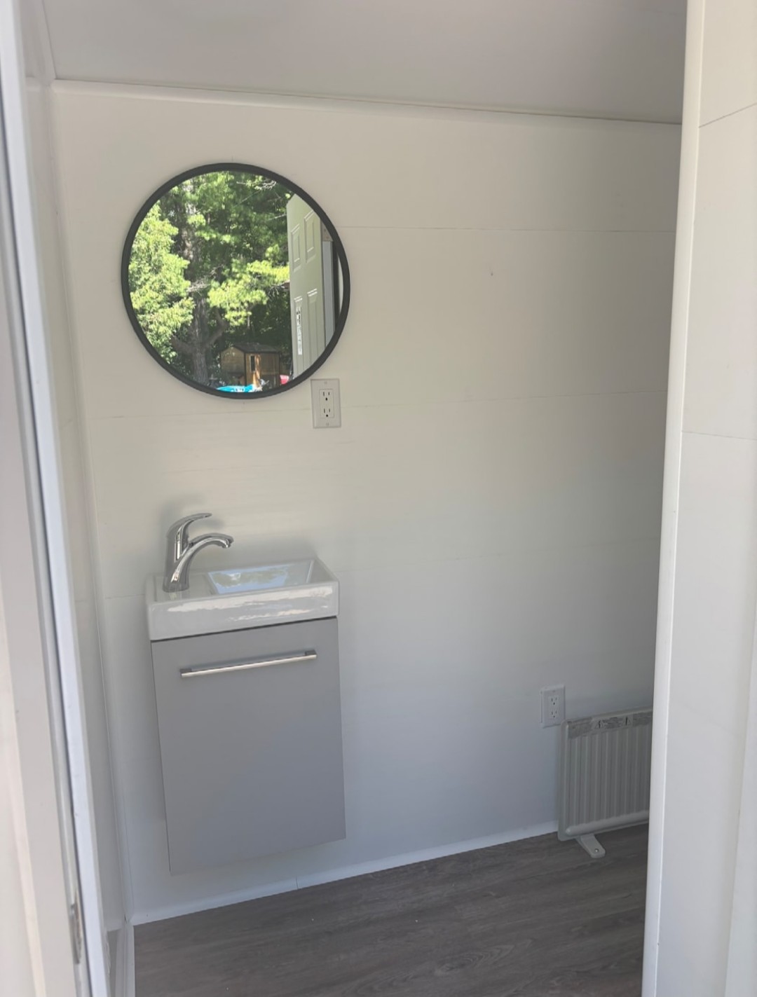 Product Description Leloo Nomad which is the Leloo Loonee or Leloo Cottage on wheels Leloo Outside Toilet Building – Exterior cladded with Corrugated metal siding Colour White White, Bright Red, Antique Linen, Charcoal, Tan, Coffee Brown, Dark Brown, Pebble Khaki, Gallery Blue, Dark Red, Stone Grey, Slate Blue, Regent Grey, Tile Red, Melcher’s Green, Bone White, Plum QC 5/4 Cedar decking. Metal corrugated roof and matching trim and corners. Colour White White, Bright Red, Antique Linen, Charcoal, Tan, Coffee Brown, Dark Brown, Pebble Khaki, Gallery Blue, Dark Red, Stone Grey, Slate Blue, Regent Grey, Tile Red, Melcher’s Green, Bone White, Plum QC Batt Insulation Trusscore interior finished walls Vinyl Plank Flooring This unit will be set on a single axle trailer and is able to be mobile. Excellent solution for remote work sites.